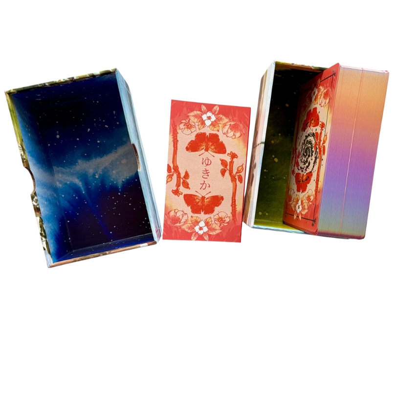In diesem Tarotdeck sind die traditionellen Rider-Waite-Smith-Strukturen erkennbar, aber mit einem persönlichen Blick neu gestaltet. Einige Karten tragen andere Namen, passend zu einer zeitgemäßen Vision einer japanisch-amerikanischen Künstlerin im Jahr 2025. Der Name Yukika, was als glückliche Blume übersetzt werden kann, bildet den Kern der Atmosphäre: eine Einladung, im Körper präsent zu sein und die eigene Umgebung zu beobachten.