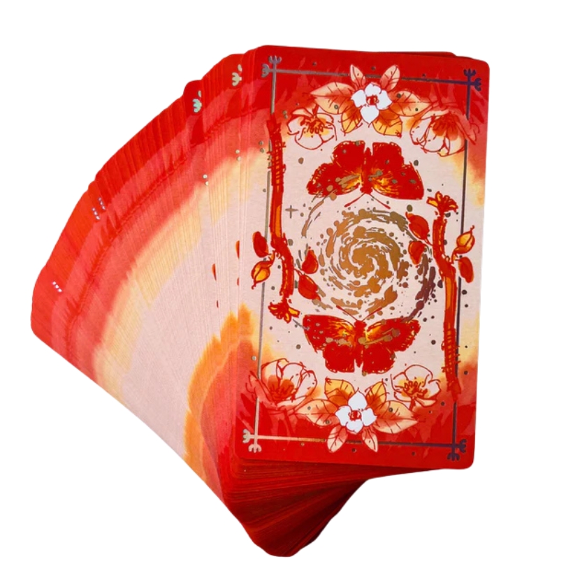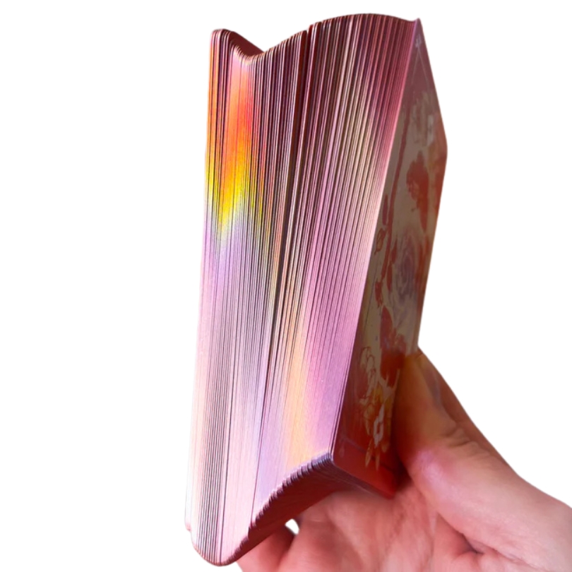 Das Yukika Tarot öffnet eine Welt aus sanften Aquarelltönen, in der die Bilder als stiller Ruhepol dienen. Die Karten zeigen eine Sammlung von Gemälden, die den Raum zwischen verschiedenen Welten erkunden, mit einer Formsprache, die sich sowohl fließend als auch zugänglich anfühlt. Die weichen Texturen der Farbe verschmelzen mit scharfen, pink-blauen holografischen Details auf der Rückseite und den Rändern der Karten.