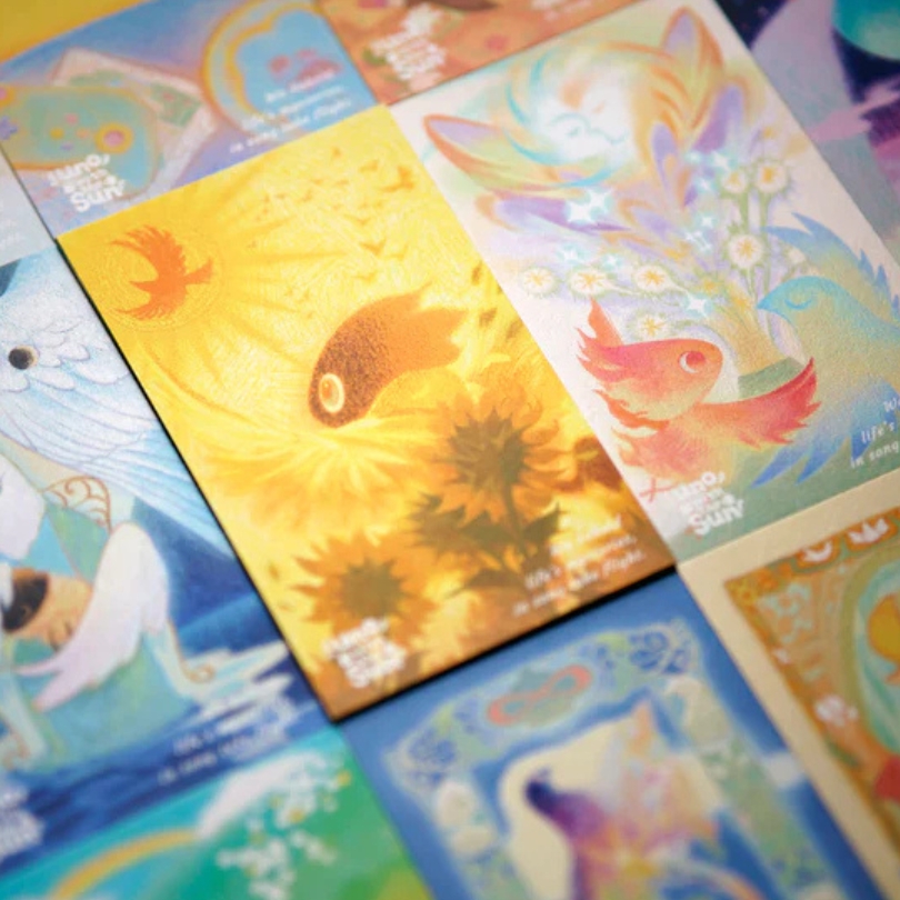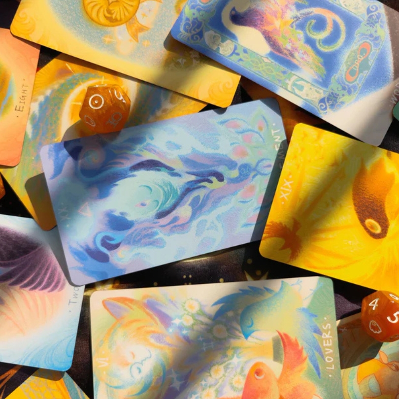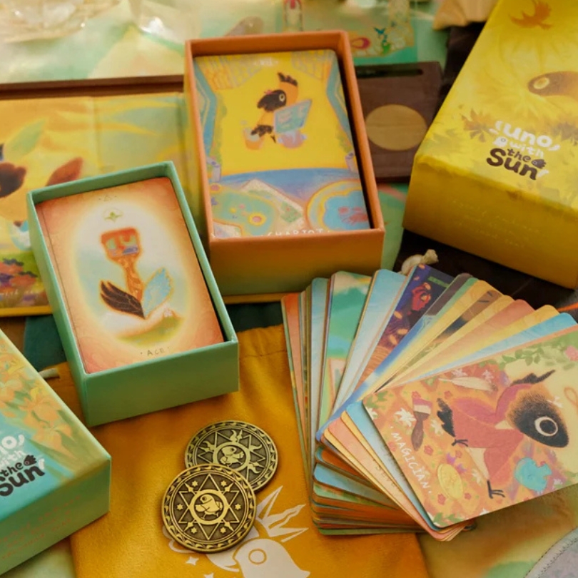 Uno with the Sun Tarot connects the classic Rider-Waite-Smith structure with a distinct visual style. The cards follow the journey of Uno, a crow moving between everyday observation and imagination. The artwork blends soft pastel tones with painterly textures and clear symbolic references.