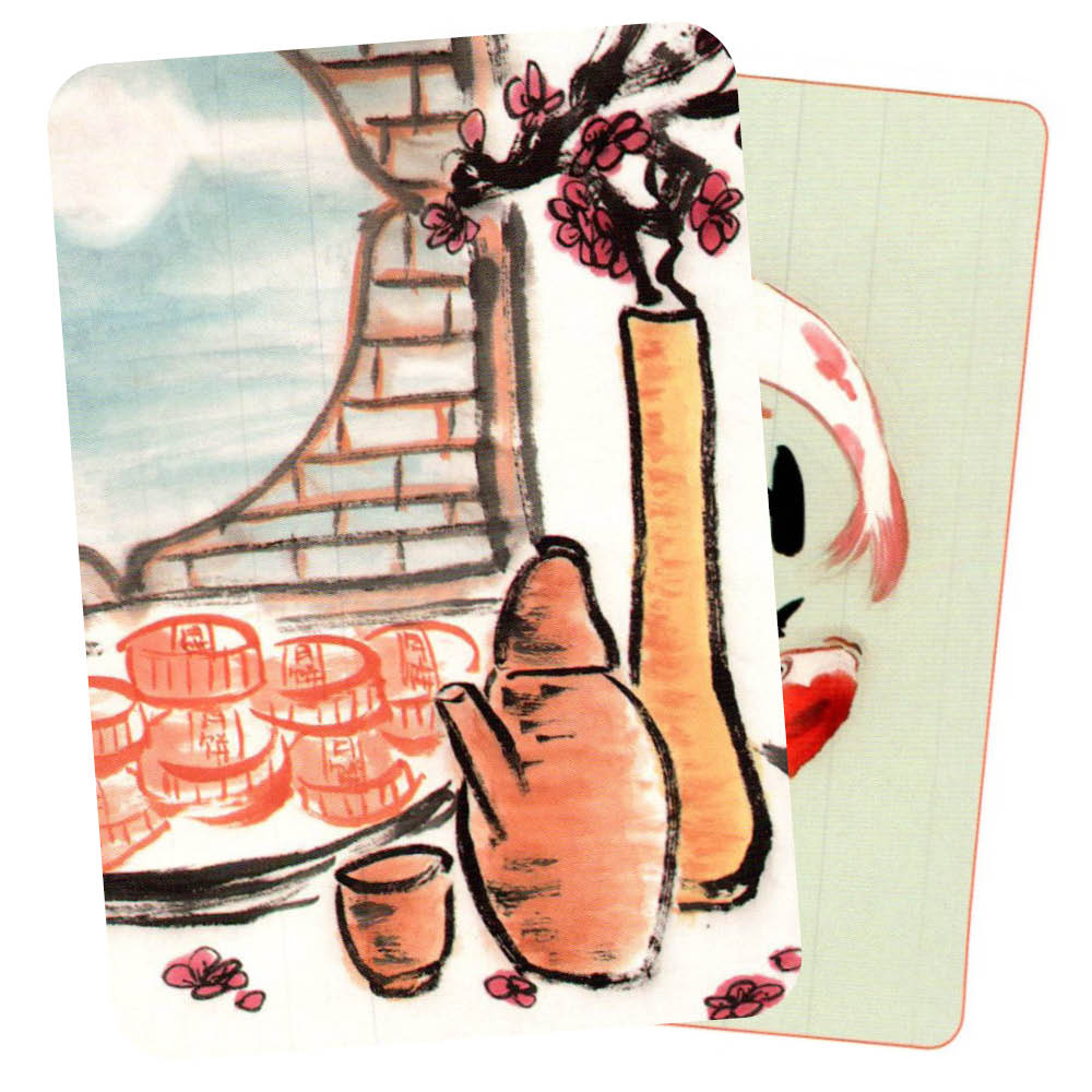 Cada tarjeta representa un objeto, escena o personaje que apunta a un significado o historia más profundo. Las pinceladas suaves y los colores brillantes reflejan la estética tradicional de la pintura china. las cartas no pretenden contar una historia fija, sino invitar al lector a interpretar y crear nuevas narrativas. Esto crea una historia personal y única una y otra vez que tiene sus raíces en la sabiduría antigua y la imaginación moderna.