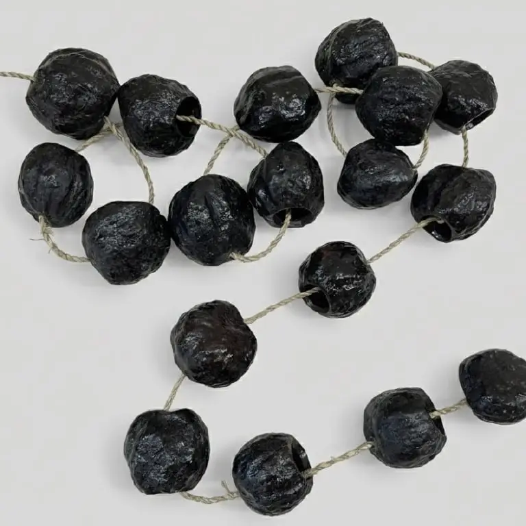Réalisée dans de petits ateliers balinais, où les noix sont enfilées à la main sur une corde résistante. Les variations naturelles de taille, de texture et de teinte donnent à chaque Kameri son caractère.