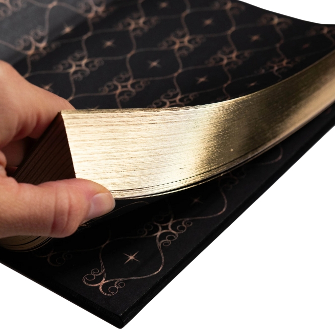 - Zwarte katoenen kaft met goudfolie en dik papier van 120 g/m²