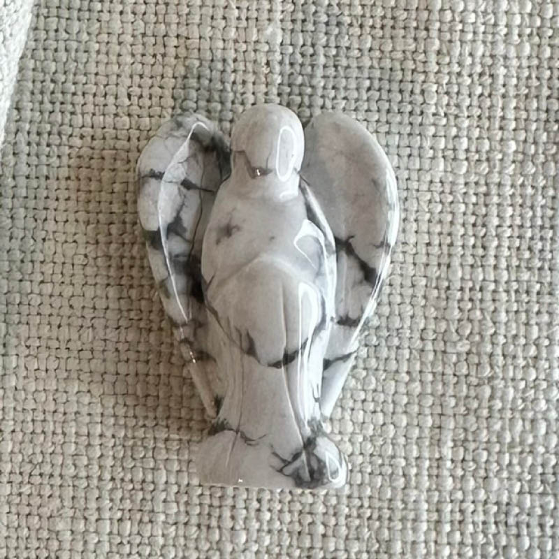 Howliet staat bekend om zijn kalmerende kwaliteit. Hij helpt gedachten te vertragen, vergroot het gevoel van ruimte en bevordert milde, eerlijke communicatie. De natuurlijke adering maakt elke steen – en dus elke engel – uniek.