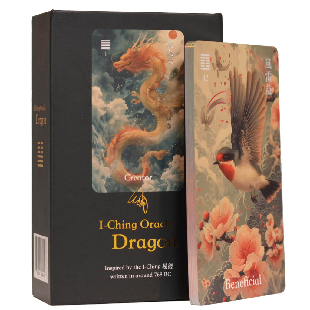 Een orakelkaartenset gebaseerd op de I-Ching, met illustraties geïnspireerd op Chinese draken en mythologische dieren.