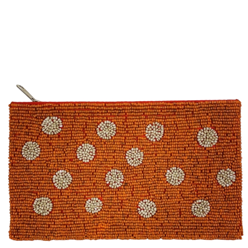 Handgemaakt kralentasje met een oranje basis en zandkleurige stippen, volledig vervaardigd in Bali. De fijn geregen kraaltjes geven elk tasje een eigen karakter. Voorzien van een stevige ritssluiting en geschikt als tarottasje, make-upetui of voor kleine persoonlijke items. Compact van formaat en makkelijk mee te nemen.