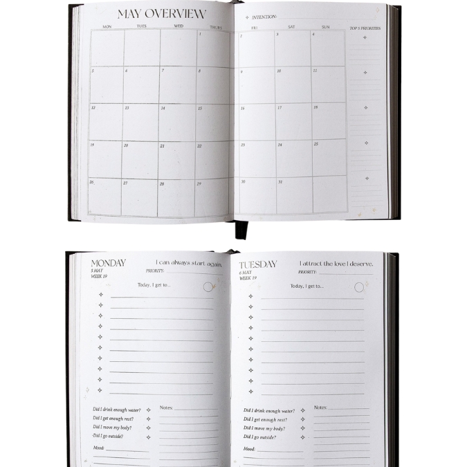 Noteer elke ochtend je prioriteiten en sluit de dag af met een korte zelfzorg-check. Dankzij het compacte formaat neem je hem gemakkelijk overal mee naartoe.