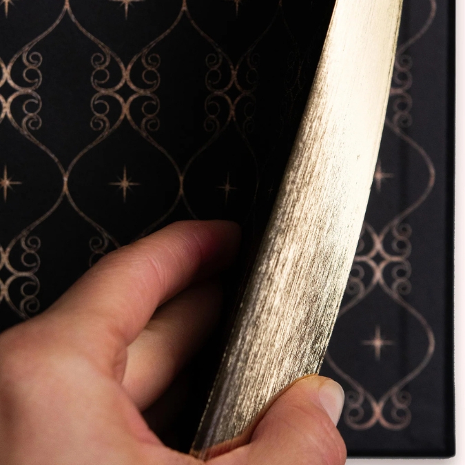 - Omslag: roze katoenen kaft met goudfolie