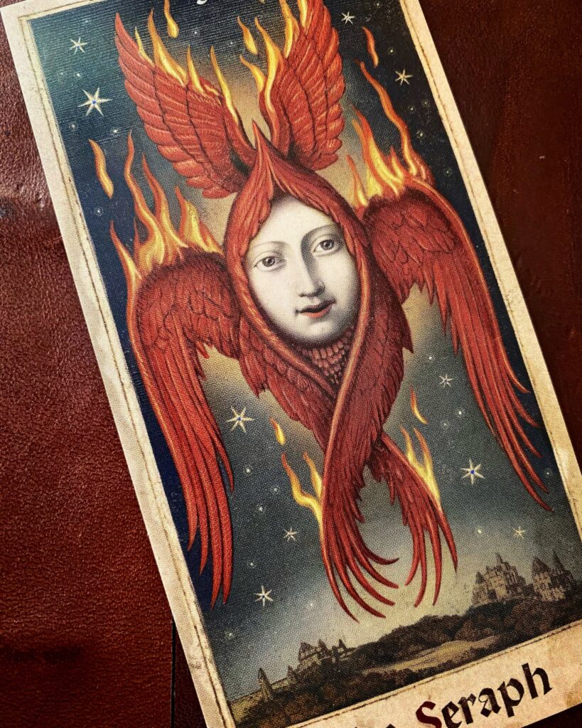 In plaats daarvan: vreemde medische instrumenten, mismaakte poppen, obscure wezens. Valenza fotografeert texturen van roest, oude muren en grafstenen en verwerkt die digitaal in zijn illustraties. Het geeft de kaarten een tastbare veroudering die je zelden ziet bij digitaal gemaakt werk. Elk kaartje heeft een kort trefwoord dat de 'voorspelling' van de tweeling weergeeft.