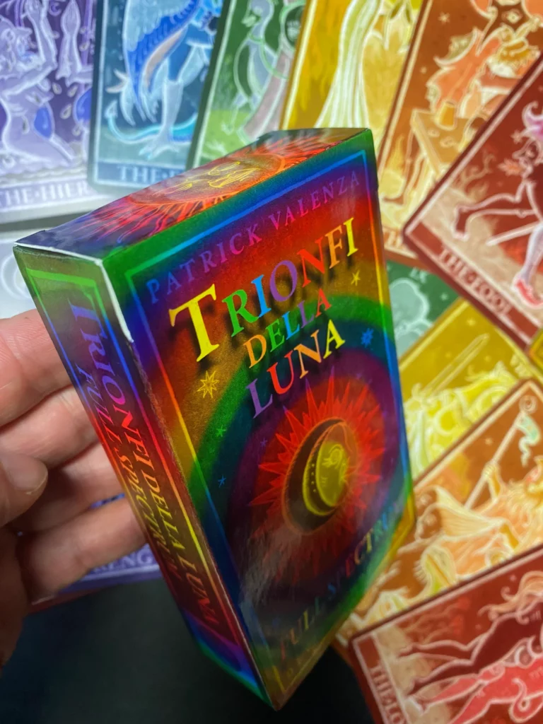 Patrick Valenza is de maker van het Deviant Moon Tarot, een van de meest herkenbare moderne tarotdecks. Zijn stijl is donker, surrealistisch en vol eigenwijze details. De Trionfi Della Luna is zijn eerbetoon aan de Tarot de Marseille-traditie, uitgewerkt in verschillende edities, waarvan de Full Spectrum Paradoxical Edition de meest kleurexplosieve variant is.